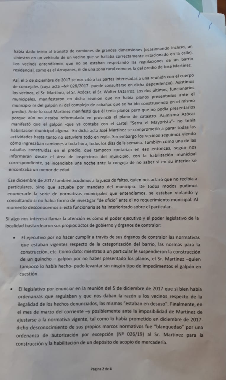 Un grupo de vecinos del Barrio Arrayanes viene cuestionando hace tiempo una serie de construcciones sin control en esa zona, por parte del conocido comerciante José Martinez, más conocido como "el chaqueño". Los vecinos reclaman al estado municipal (ejecutivo y legislativo) que en principio informen sobre las obras de construcción de un galpón de grandes dimensiones, que hasta hace poco no contaban con ninguna habilitación. Parte del galpón se vino abajo con las nevadas de junio, pero no se sabe qué tipo de control existe, además de que transitan vehículos de gran porte, entre otras molestias para los habitantes del barrio. Alma y Damián se acercaron a la radio para contarnos sobre la situación, que sigue luego de un mes sin respuesta de ningún funcionario. Compartimos también la nota presentada por los vecinos.